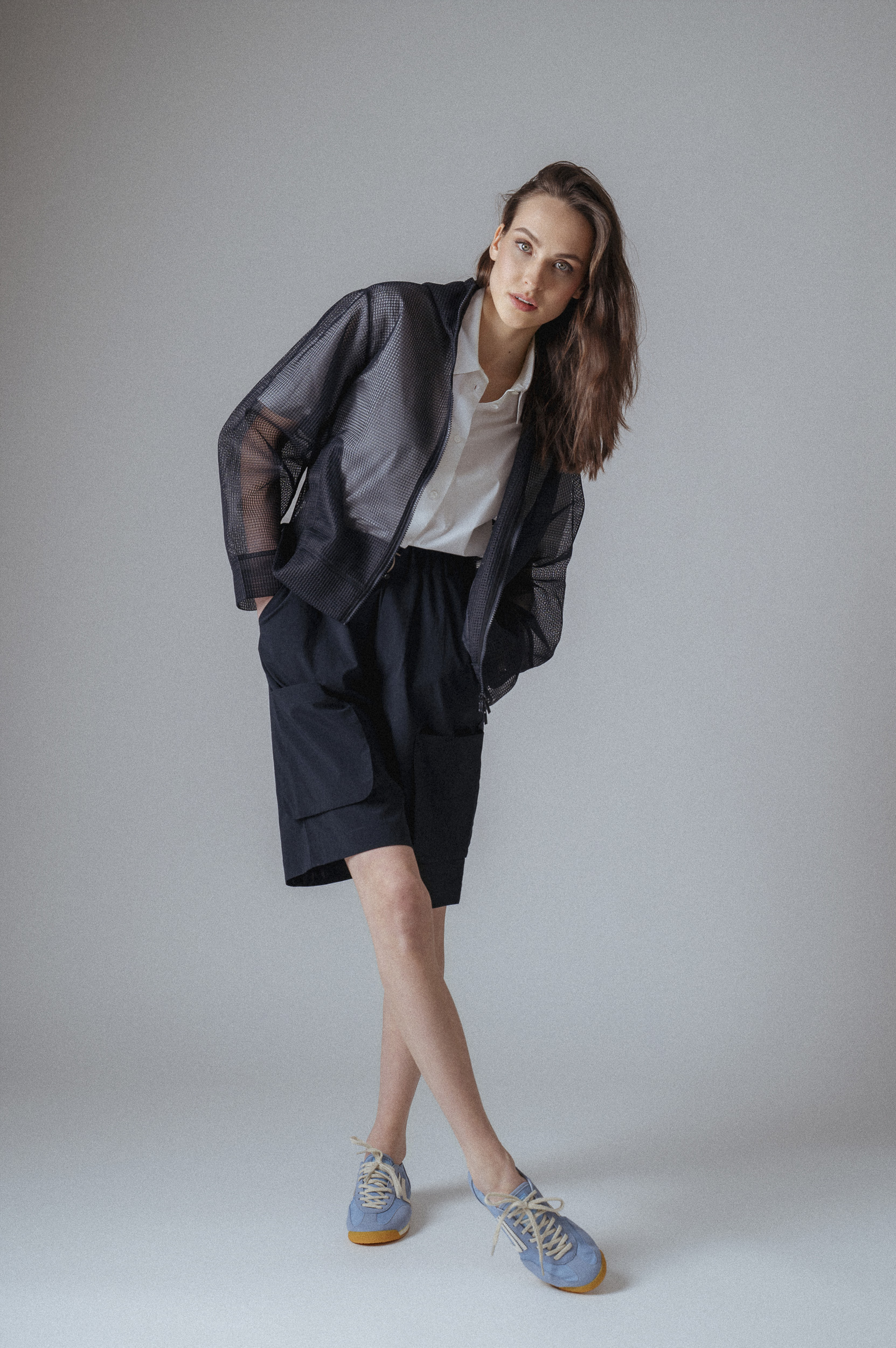 Die Bermuda Hose wird hier neu interpretiert: In Kombination mit einer weißen Bluse und einer transparenten, leichten Jacke entsteht ein spannender Layering-Effekt.