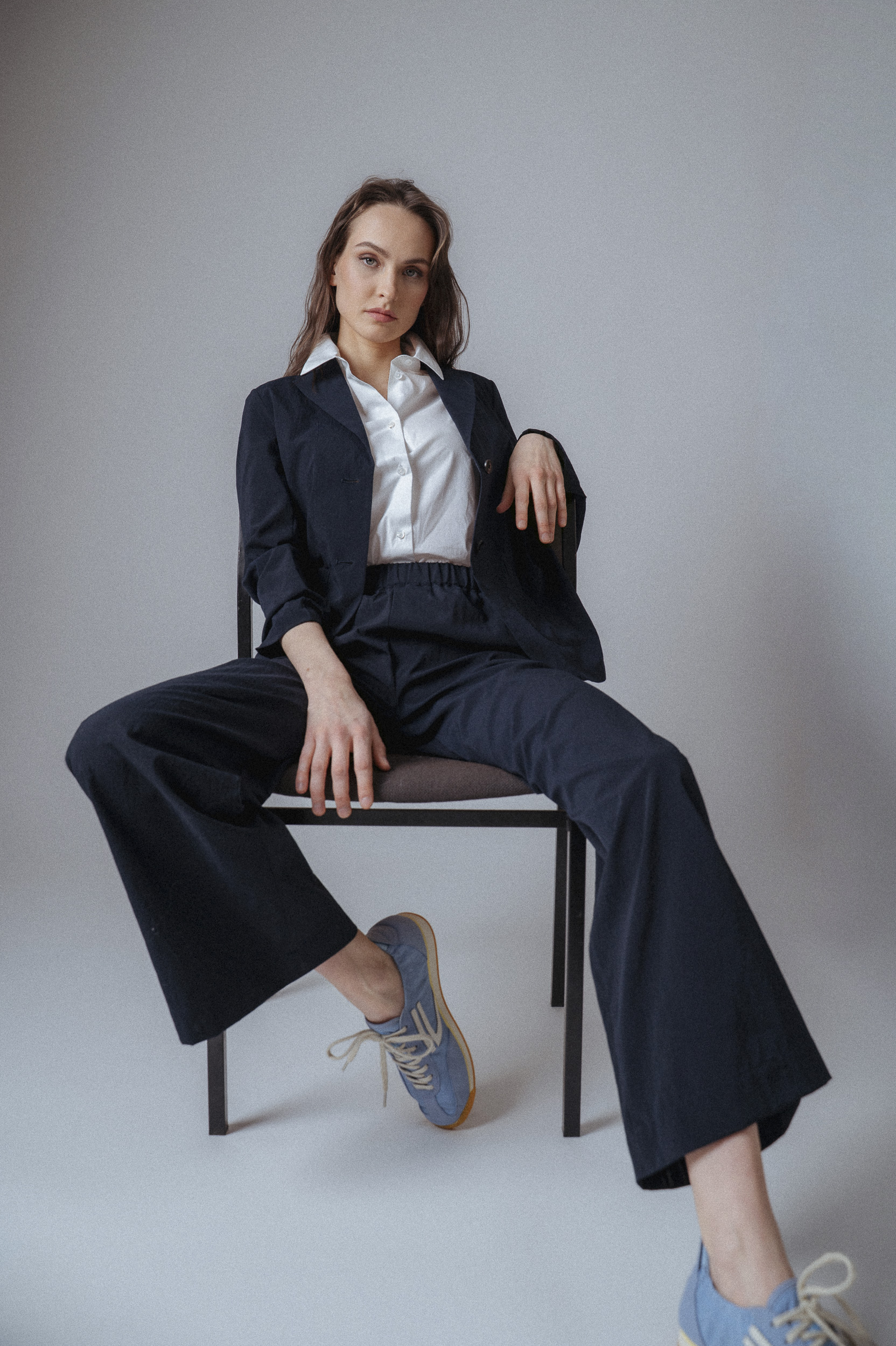 Ein Look von Lisa Lareida, der Business und Freizeit mühelos verbindet: Die weit geschnittene, marineblaue Stoffhose wirkt durch ihre fließende Silhouette. Kombiniert mit einer klassischen weißen Bluse und einem marineblauen strukturierten Blazer entsteht ein cooler Look.